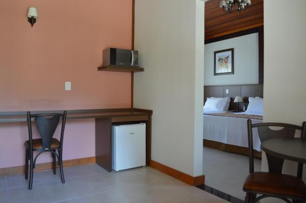01 cama queen e 02 camas de solteiro, ar condicionado com aquecedor, TV 40”, cofre digital, frigobar, microondas, telefone e secador de cabelo.